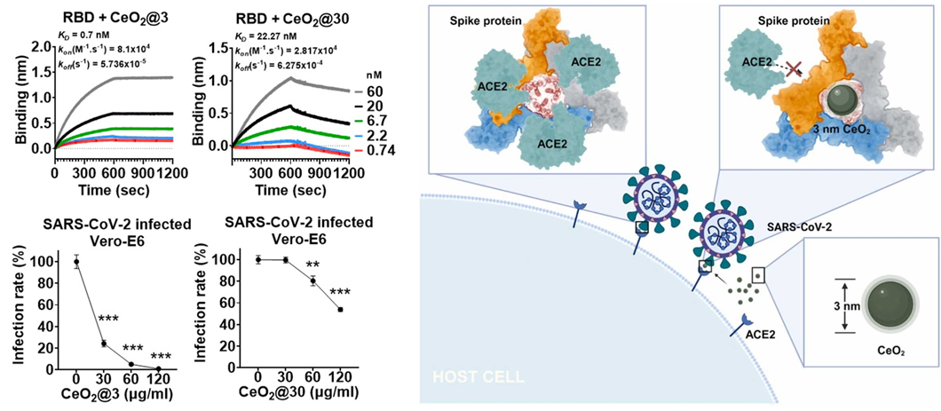 图1 纳米颗粒的大小对抗病毒活性至关重要。3和30 nm的CeO2纳米颗粒对RBD的亲和力类似,但抗病毒效果相差很多,这是由于3 nm的CeO2纳米颗粒可以插入S蛋白三聚体的空腔中,阻断RBD-ACE2相互作用,进而具有高效的抗病毒活性。