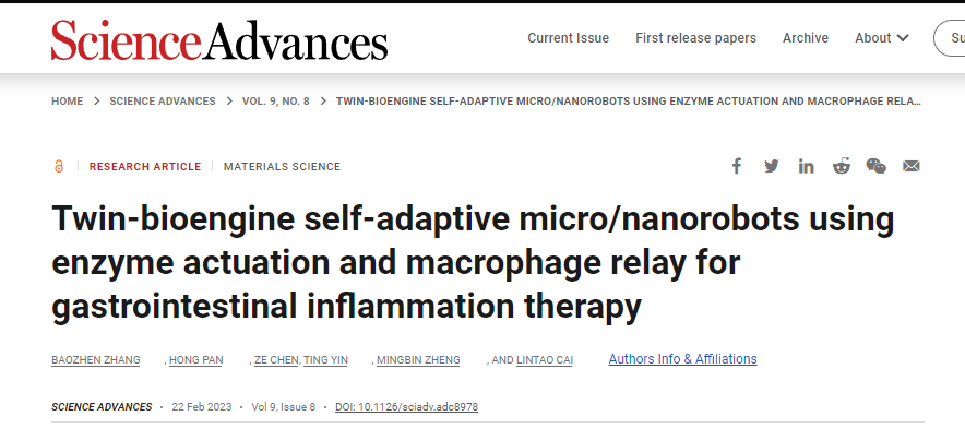 北京时间2月23日,中国科学院深圳先进技术研究院医药所纳米医疗与技术研究中心蔡林涛团队在国际学术期刊Science Advances上发表了题为“Twin-bioengine self-adaptive micro/nanorobots using enzyme actuation and macrophage relay for gastrointestinal inflammation therapy”的文章。该工作成功开发了一款双引擎自适应的酵母微纳生物机器人,能够像“纳米快递员”一样,通过生物酶与巨噬细胞引擎的切换(Enzyme-Macrophage-Switching,EMS)穿透人体多重生理屏障,实现精准的将药物递送到远程炎症病灶。